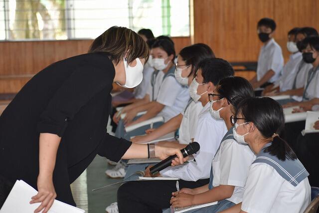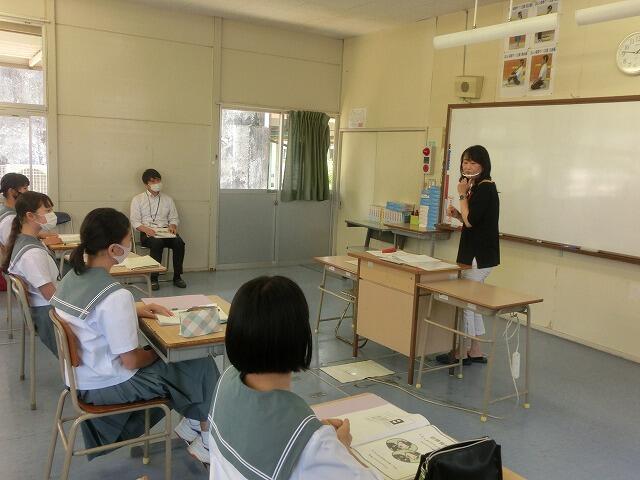 今回(6月8日(火曜日)6校時)は、4月からえびの市地域おこし協力隊員として着任されたアメリカ出身の高杉せれなさん(ANA CA)を講師に迎え、マナー学習を行いました。