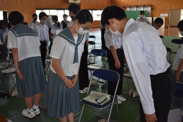 各学年の代表生徒は、夏休みの反省と今後の抱負を発表しました。「友達と協力して学校の行事に取り組みたい」「英単語を書けるようになったり、計算ミスを減らしたりしたい」「どんなことにも疑問をもち、自分の考えをしっかりもちたい」「自分の決めたことを最後までやり遂げたい」「効率のよい勉強法を探したい」「体調を崩さずに生活したい」など、自分の考えをしっかりと発表してくれました。これらのことが実現するように頑張ってくれると期待しています。
