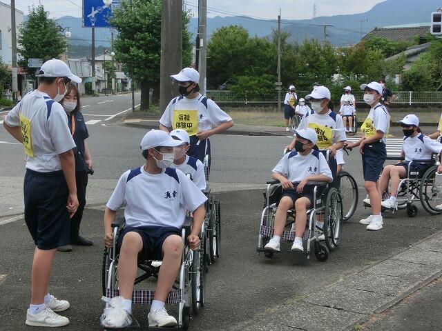 車いす体験では学校から京町温泉駅まで車いすで行き、スロープ等での体験も行いました。ふだんの生活ではあまり気にすることのない歩道の段差等にとても苦労している様子がありました。また、介助する方も段差に気付き、早めに声掛けをすることが大切だと感じたようです。