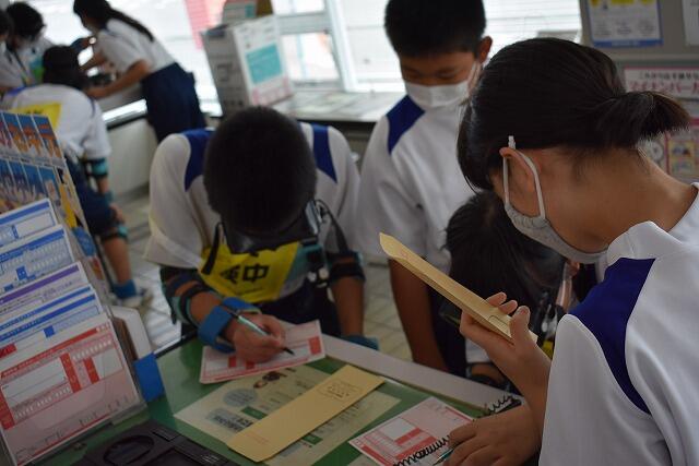 高齢者疑似体験では学校から真幸郵便局まで行き、郵便局内で書類を実際に書いたりしました。おもりやゴーグル等の装具を付けたことで、体がうまく動かないことや疲れやすいことも経験することができました。(真幸郵便局の皆さん、ご協力ありがとうございました)