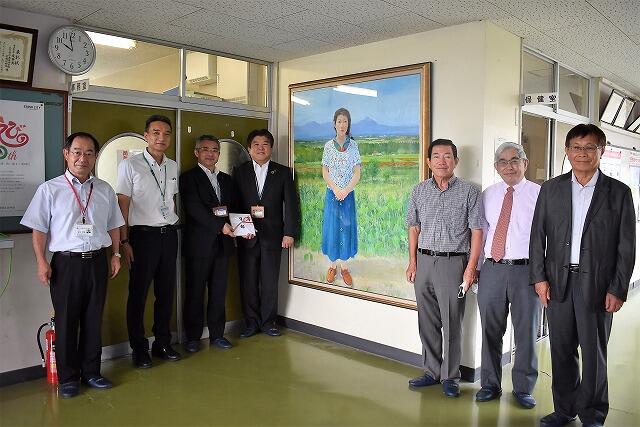 このほど、本校出身の画家、塩屋信敏さんから、日展入選作「南風」の寄贈がありました。同時に、会社経営の相徳憲一さん、小野悟さんから絵画の額縁の寄贈がありました。7月8日(木)には、えびの市長、えびの市教育長、真幸小学校校長先生が来校され、寄贈式が行われました。塩屋さんは「自分の作品が後輩たちの刺激になればいい」と話されていました。