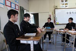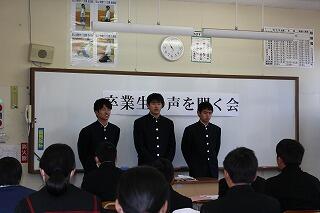 本校から各高等学校に進学した生徒を招き、中学校時代の経験や高校での過ごし方などを今後の参考にするためです。