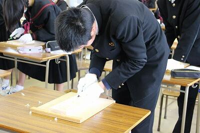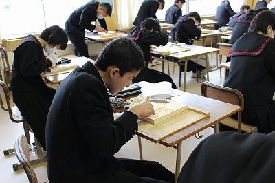 午前中の3年生は美術の時間で表札を彫り進めていました。