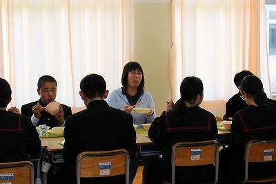 2年生の教室ではALTも入っての給食でした。