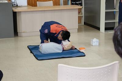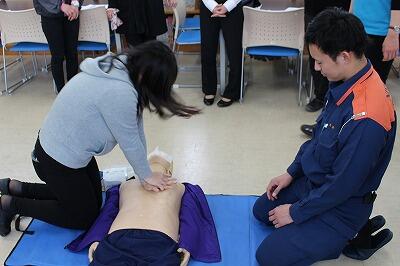 市の消防署員の方においでいただき、心臓マッサージやAEDの使い方について訓練を行いました。