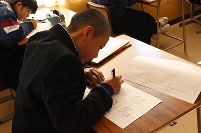 午前中、やや寒さも緩み、1年2組は日当たりのいい美術室で立体文字の練習をしていました。