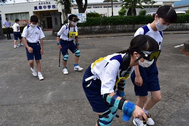 車いす体験では学校から京町温泉駅まで車いすで行き、スロープ等での体験も行いました。ふだんの生活ではあまり気にすることのない歩道の段差等にとても苦労している様子がありました。また、介助する方も段差に気付き、早めに声掛けをすることが大切だと感じたようです。