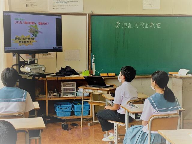 7月16日(金曜日)に、薬物の心身におよぼす影響や怖さを知り、薬物に対する認識を高めるとともに、薬物の誘惑に負けない意識を育てることを目的として薬物乱用防止教室を行いました。宮崎市郡薬剤師会阿波岐ヶ原病院薬剤師の日髙華代子先生を講師に迎え、『STOP the 薬物! ~断る勇気が未来をつくる~』という内容の講話をお聞きしました。