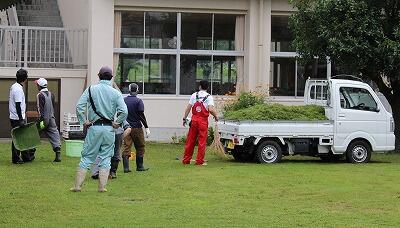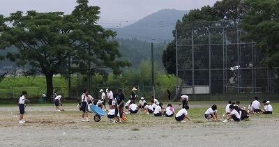 機械を使う作業や園庭の除草などを大人が行い、グラウンド内の除草作業や石拾いなどを生徒が行いました。