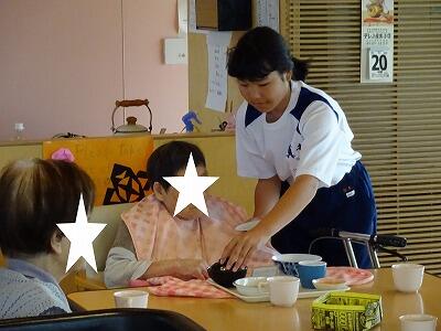 養護老人ホーム「涼風園」では、自己紹介の後、お話の相手をしたり、食事のお世話をしたりしました。