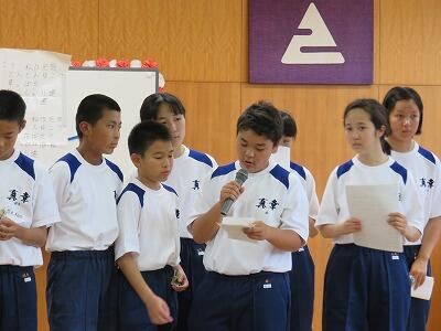 この日、2年生が正門前、3年生が真幸小学校に行って登校してくる児童・生徒に声をかけました。