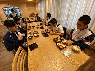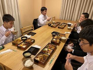 夕食です。コロナ対策もあり、お重になっていました。充実した食事にみんな喜んでいました。
