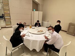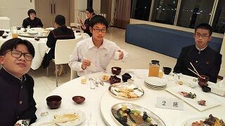 夕食です。場所の雰囲気に緊張しています。