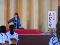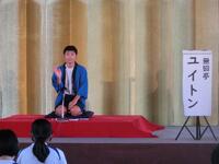 7月14日(木)に鑑賞教室(文化庁巡回公演事業による伝統芸能)を実施しました。東大卒の落語家 春風亭昇吉さんをはじめ6名の方々が、落語や曲芸などを交えた「おまちど〜!お笑いどんぶり『出前寄席』」を公演していただきました。