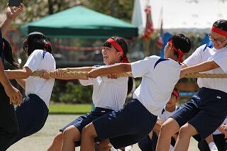 団対抗の綱引きは女子は青団、男子は赤団と痛み分けに。