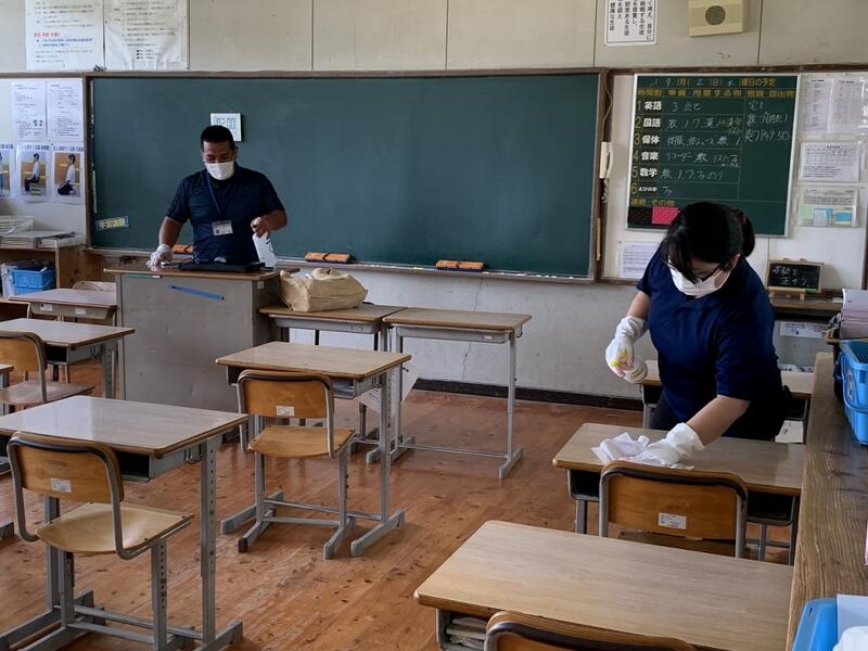 夏休みが終わり1週間が過ぎようとしています。えびの市内での新型コロナウイルス感染者急増に伴い、学校ではこれまで以上の感染症対策を実施しています。朝は靴箱での職員による検温から1日がスタートし、放課後は全職員で分担して消毒作業に取り組んでいます。また、一昨日は、保健室の隣の相談室を「第2保健室」として整備しました。発熱・風邪症状の生徒とそれ以外の生徒をそれぞれ別の部屋で対応するためです。