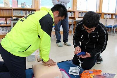 市の消防署員の方においでいただき、心臓マッサージやAEDの使い方について訓練を行いました。