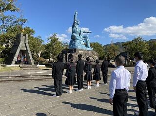 平和公園で平和集会を行いました。みんなで誓いの言葉を述べたあと、千羽鶴を奉納しました。
