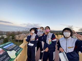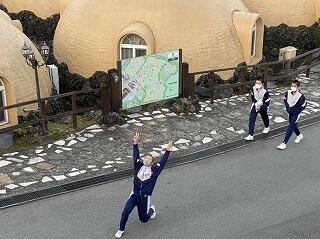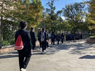 最初に、学級での事前指導のあと、風水害が発生したという設定で高い場所への避難を行いました。生徒達は校内放送に従って、整然と移動することができました。