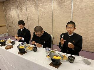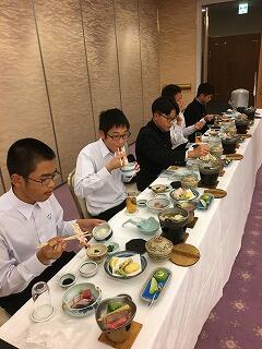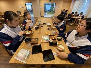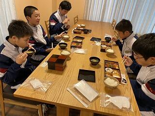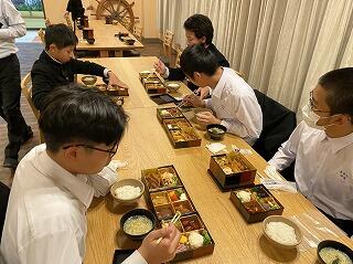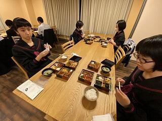 夕食です。コロナ対策もあり、お重になっていました。充実した食事にみんな喜んでいました。