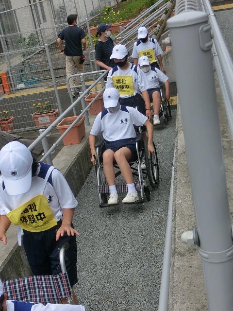 車いす体験では学校から京町温泉駅まで車いすで行き、スロープ等での体験も行いました。ふだんの生活ではあまり気にすることのない歩道の段差等にとても苦労している様子がありました。また、介助する方も段差に気付き、早めに声掛けをすることが大切だと感じたようです。