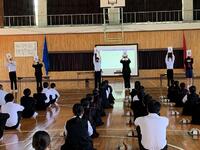 えびの市手話言語条例など手話についてのお話をしていただいたあと、実際に自分の名前やあいさつの仕方を学びました。「山」であれば山をイメージした手話になっており、イメージと結びつけながら、手話を学習していました。最後には、手話を交えて「365日の紙飛行機」をみんなで歌いました。講座のあとの質疑応答では、「耳が聞こえないことにより、普段の生活で困ることはありませんか?」など、生徒たちの積極的に質問する姿がありました。これからの福祉学習につながりそうです。