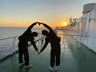 フェリーに到着しました。海に沈む夕日に大興奮。夕食はバイキングでこちらも大興奮でした。