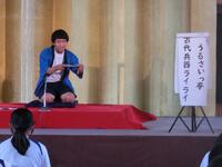 7月14日(木)に鑑賞教室(文化庁巡回公演事業による伝統芸能)を実施しました。東大卒の落語家 春風亭昇吉さんをはじめ6名の方々が、落語や曲芸などを交えた「おまちど〜!お笑いどんぶり『出前寄席』」を公演していただきました。