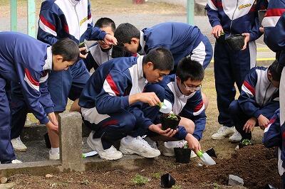 午後の掃除の時間を利用して、卒業式に向けて、花の苗の植え替えをしました。
