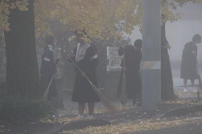 その霧の中、バスケットボール部とソフトボール部がホーキとちり取りを持って駅方面に向かいました。