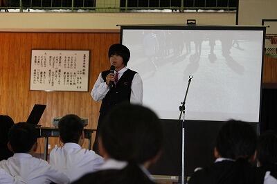 最初に生徒会役員から1年生にJRCのワッペンが渡され、赤十字の精神について説明がありました。