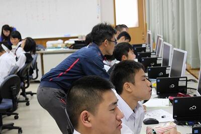 真幸中学校のパソコン室はすごいです。40人全員が一人一台でパソコンに向かいます。しかもタブレット付き‥。