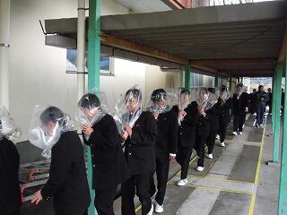 12月17日(火)、理科室から出火したという想定で火災の避難訓練を実施しました。雨天であったため、体育館に避難しましたが、今回は一酸化炭素等の有毒ガスから身を守るためにビニール袋をかぶっての避難を試してみました。講評の中でえびの消防署員の方からもいい試みなので続けて欲しいとお褒めの言葉をいただきました。