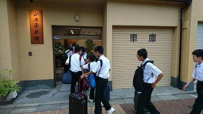 班別の研修に出発しました。雨はやや小降りになっています。 それぞれ、楽しみながら、戸惑いながらの自主研修。一生懸命、頑張りました。 食事はスイーツ屋さんで済ませた班もあったようです。女子の意見には逆らえない? みんな、「やっと着いた~。」と言いながら玄関を上がってきました。疲れた顔ですが、やりとげたという誇らしい顔でもあります。 今夜の晩ご飯は、メインが「牛の味噌焼き、九条ネギを添えて」という感じでした。京都らしく、湯葉も出ました。フルーツも付いて、みんな大満足でした。 みんなでしっかり片付けて「ご馳走さま」。そのあとロビーで本日の反省会と明日の打ち合わせを行いました。 部屋でのトランプ。暴れてませんよ! |
