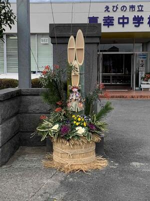 12月16日(金曜日)に、PTA役員の皆様に門松をつくっていただきました。当初は17日(土曜日)に環境整備部の皆様とつくる予定でしたが、天候不良が予測されたので、急遽代表の方のみでつくりました。