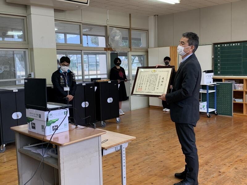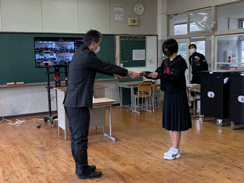 全校集会では、校長先生をはじめとした各担当の先生方からのお話と表彰を行いました。表彰は、「宮崎県武道祭第33回宮崎県武道振興錬成大会空手道競技」において 中学2年男子形で見事優勝した指宿さんと、「令和3年度中学生人権作文コンテスト」において協議会長賞を受賞した阿多さん(1年生)に賞状等を渡しました。また、同コンテストで本校が学校賞を受賞しましたので、紹介しました。