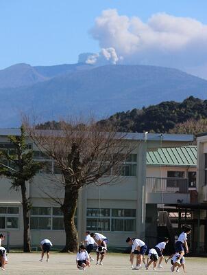 風向きの関係で、真幸地区は幸いなことにあまり影響がなく、グラウンドでは1年生がのびのびと体育の授業を行っていました。
