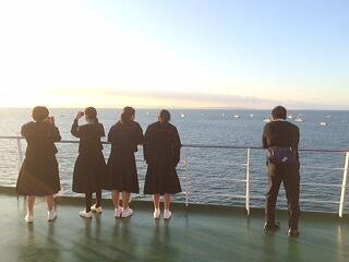 その後デッキに出て景色を楽しみました。海風が冷たく、とても寒かったですが、みんな笑顔でした。いい天気です。子どもたちは「朝日がめっちゃきれい!」