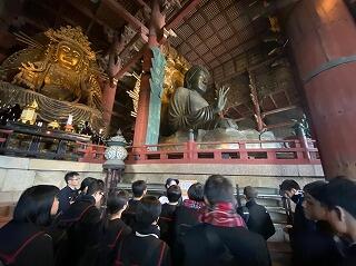 奈良公園に来ました。昼食後、二月堂に上がり、大きな東大寺、大仏様を見て来ました。観光客が少なくて多くの生徒が、柱の穴を通る体験をしました。