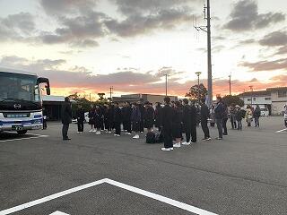 12月3日(火)7時28分。見送り、ありがとうございました。ハラハラドキドキの修学旅行が始まりました。実り多い充実した修学旅行になるように、生徒、職員ワンチームとなってがんばってきます。