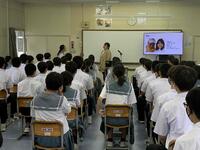 講話の内容は、被爆者である門隆さんから峯松さんがお聞きした被爆体験等をもとに、原爆が投下されたときの町の様子や家族の様子等を詳しく話していただきました。生徒は関心をもって集中して聞いていました。2年生は11月に予定している修学旅行で長崎県を訪れます。今回の内容は、事前学習としてもとても良かったと思います。また、3年生は、昨年度修学旅行で聞いた被爆者からの講話を思い出し、改めて平和について考えるきっかけになったと思います.