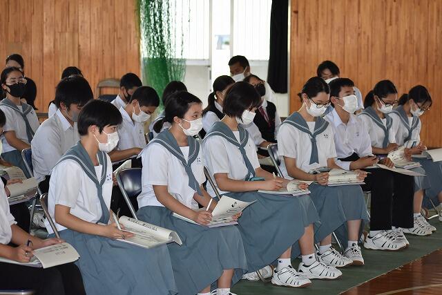 生徒たちも真剣に講話を聞き入っていました。これからの学校生活や社会生活の中で、学んだことを実践してくれることを期待します。