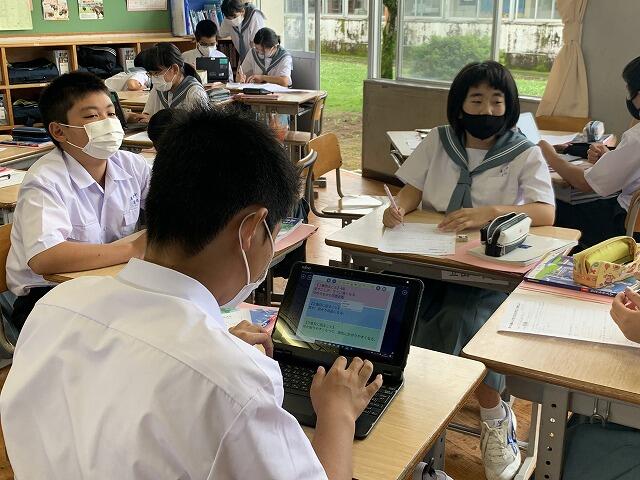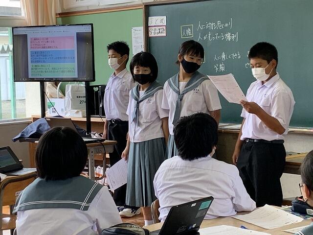 下の写真は、本日5校時の道徳の授業の様子です。自分の考えや班の考えをタブレットPCでまとめ、教室内の大型テレビに映し出して発表したり、みんなの考えを自分のタブレットPCで確認して自分の考えを深めたり・・・授業者が創意工夫して授業が進んでいました。研究授業や公開授業ではない、ごく普通の授業の一場面です。
