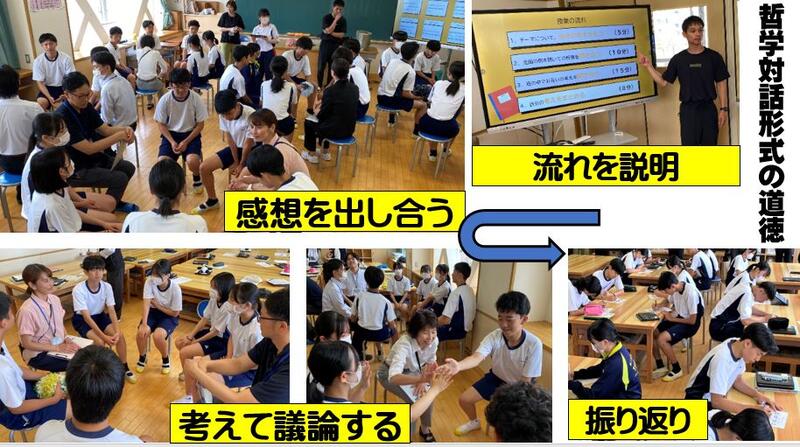 道徳の授業に「哲学対話」という手法を取り入れてみました。3年の授業において、生徒指導の島埜内先生が「夏の猛暑日にはどんな服装がよいのだろうか?」というテーマを投げかけ、活動がスタート。全国の例(自由服、派手出ない自由服、体操服、ジャージなど)を理解した後に、「その感想を述べ合う」「妻中にふさわしい服装とは」などについて輪になって考えを深め合います。