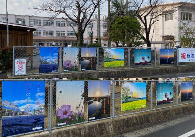 ②次に、郷土PRポスター看板の設置です。昨夏、全校生徒が郷土の魅力をPRするポスター作成に取り組みました。多くの生徒がお気に入りの西都の景色を自分で撮影し、それにキャッチコピーをつけていきました。生徒や職員が投票で選んだ6枚を看板にし、校門横のフェンスに設置しています。どうぞご覧ください。