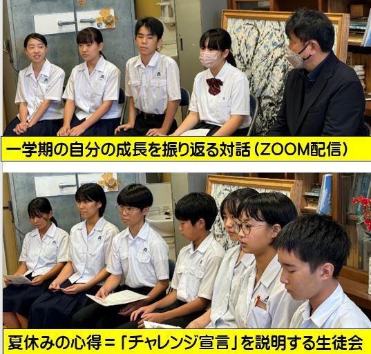 また生徒会からは、自分たちで作った夏休み中の生活の心得=「夏休み中のチャレンジ宣言」について全校生徒へ説明がなされました。夏休みをぜひ有意義に過ごしてください。