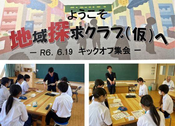 令和8年度から開校する西都中では、新たな文化系活動の一環として、地域主導の「地域探究クラブ」の活動が構想されています。その試みとして本年度より希望者を募り、同クラブの活動がスタートする運びとなりました。現在のところ、2・3年生7名が応募してくれ、6月19日に活動がスタートしました。