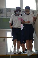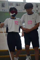 写真はブラインドウォークの様子です。アイマスクをして友達のサポートを受けながら、白杖での歩行体験を行いました。見えない心細さとサポートしてくれることの安心感を感じ、視覚が不自由な方が安心してサポートを受けられるように考えていきたいと感想を描いている生徒もいました。