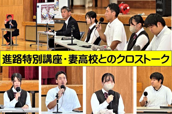 5月29日、妻高校の先生と生徒に来ていただき進路特別講座(クロストーク)を行いました。これから進路選択を控えている3年生を対象に、妻高校の全学科の先輩方が直接お話をしてくれました。主幹教諭の前田先生が多極的な話を、そして生徒たちからは具体的で三個になる話がきけて、とても学びの多い時間となりました。