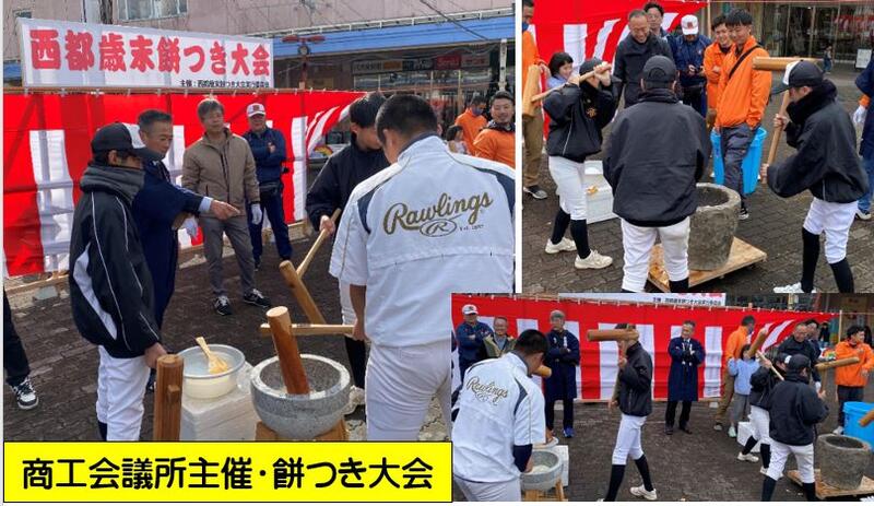 12月26日10:00より、パオ横のあいそめ広場で、西都商工会議所による西都餅つき大会が行われました(コロナ禍明け、昨年から実施されてます)。市長や商工会議所会頭などによるつき初めに続き、校長の私や野球部の生徒も参加させていただきました。妻高校女子サッカー部も手伝ってくれ、和やかな年末の催しとなりました。